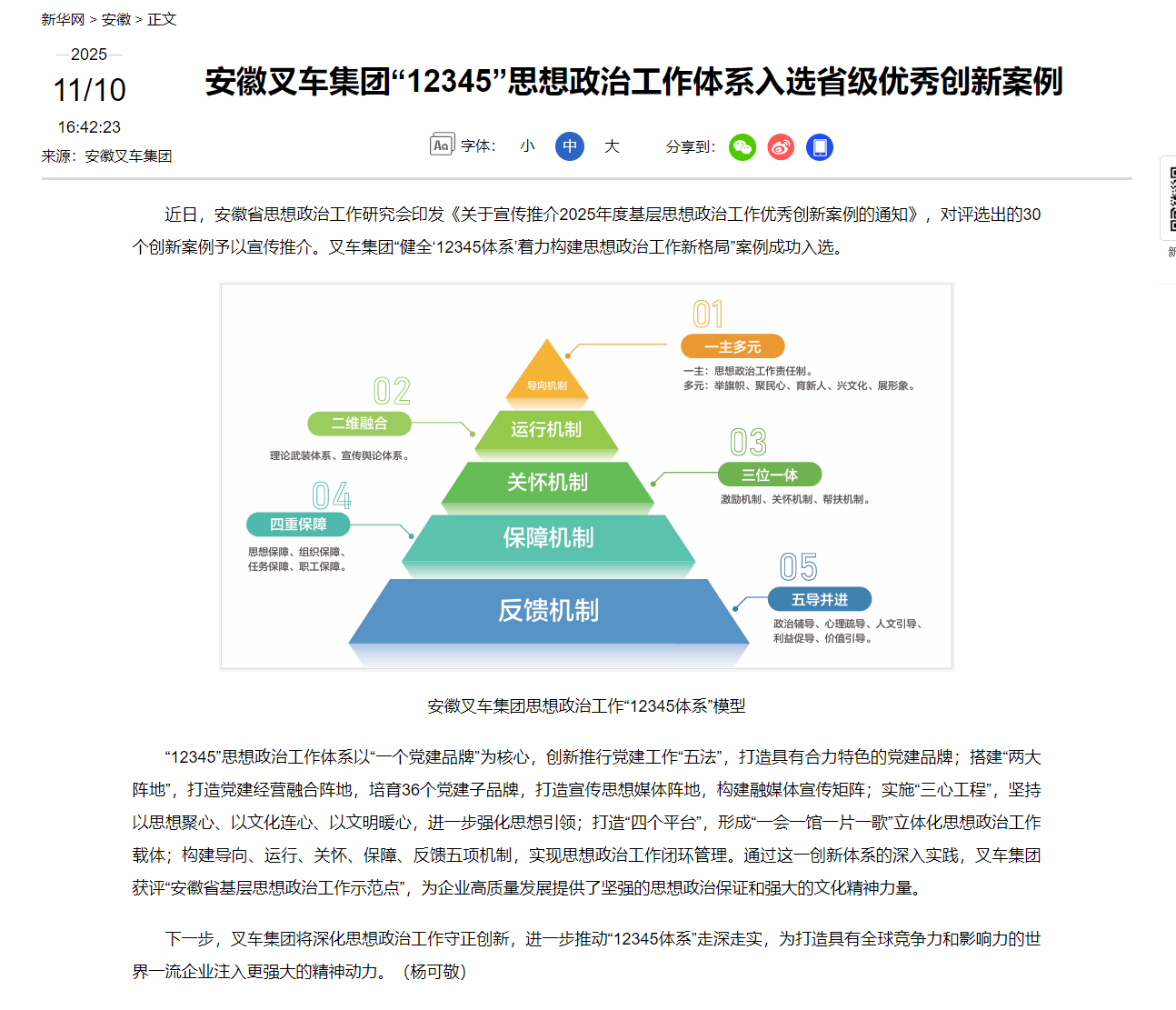 【新華網】安徽叉車集團“12345”思想政治工作體系入選省級優秀創新案例